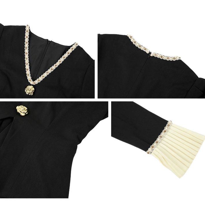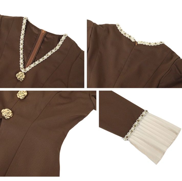 ゴールドの装飾ボタンと袖のフリルが華やかさを引き立て、エレガントな印象を与える